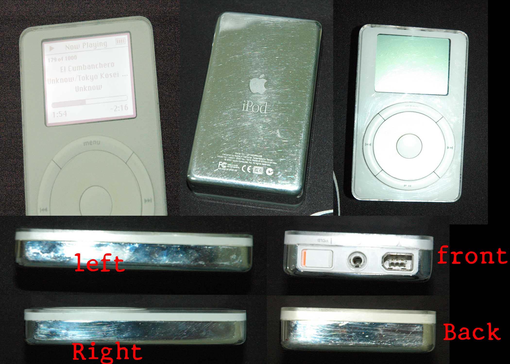 ตัวเครื่อง Ipod Gen1 5GB ซีเรียลตรงครับ HDD ไม่มีbad เป็นของมือเดียวครับ แบตเพิ่งไปเปลี่ยนก้อนใหม่มาที่ ร้านฮวก แบงค์ จ้า ลง rockbox แล้ว ลองเปิดได้ 6-7ชั่วโมงโดยประมาณครับ ฝาหลังมีรอยขน น้องแมวครับ ในรูปถ่ายไม่ค่อยชัด