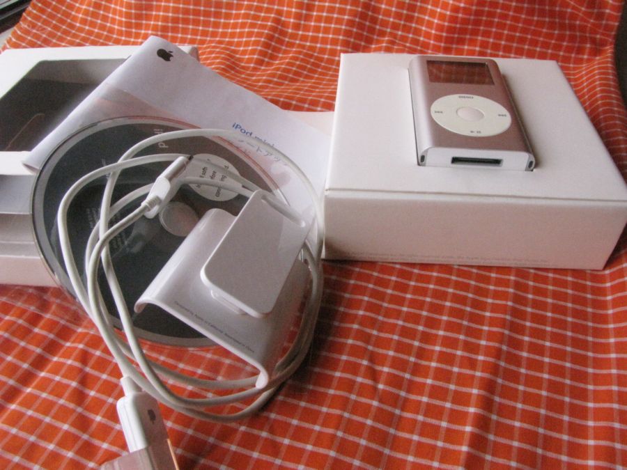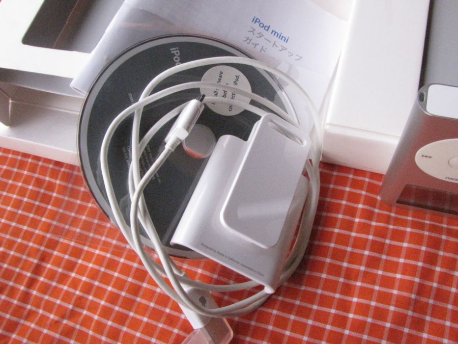 กล่องภายในกับอุปกรณ์ สายซิงค์ ซีดี คู่มือ และไอพอดมินิ