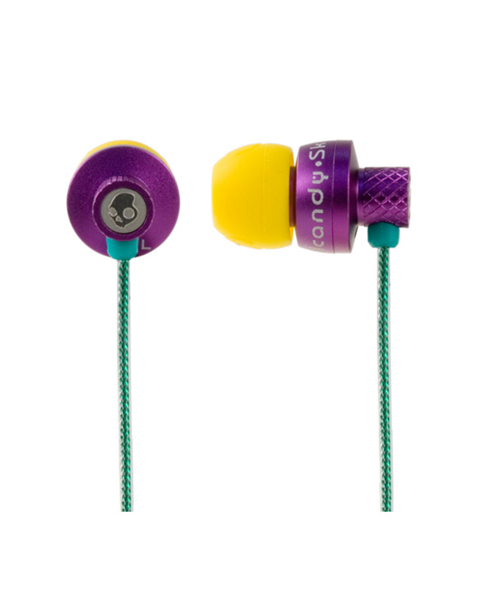 ตัวหูฟังสีม่วง สายหูฟัง สีเขียวๆ จุกยางสีเหลืองครับ (เหมือนในรูป)
