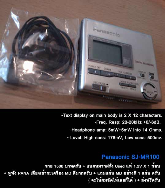 ปรับราคาขายเหลือ 1500 บาทครับ + แบตหมากฝรั่ง Used แท้ 1.2V X 1 ก้อน + หูฟัง PANA เสียงเข้ากะเครื่อง MD ดีมากครับ + แถมแผ่น MD อย่างดี 1 แผ่น ครับ ( จะให้ผมอัดให้เลยก็ได้ ) + ส่งฟรีครับ