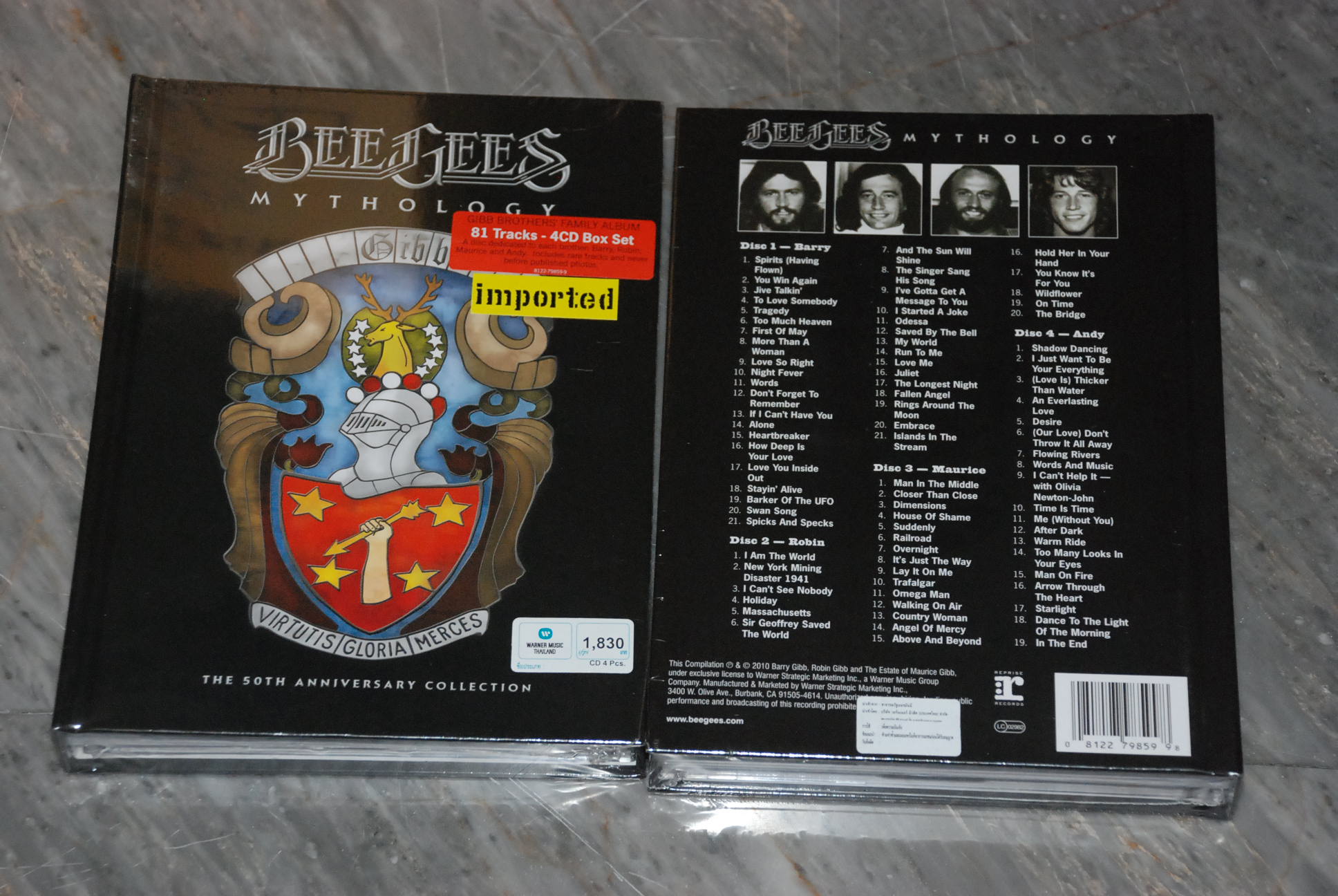 BEE GEES Mythology บ็อกเซ็ตที่ผลิตขึ้นมาพิเศษเพื่อฉลองวาระ 50 ปีของวง บรรจุ 4 ซีดี 81 เพลงในกล่องดิจิแพ็คอย่างดี โดยเพลงในแต่ละซีดีนับเป็นสุดยอดของแต่ละสมาชิกในวง ที่ได้รับการคัดเลือกมาอย่างบรรจงโดยตัวพวกเขาเองและคนใกล้ชิด แบร์รี่และโรบิน กิบบ์ เป็นผู้เลือกเพลงของพวกเขาเอง ส่วนของมัวริซนั้น อิวาน ภรรยาหม้ายของเขาเป็นผู้เลือกให้ ร่วมกับลูกๆ ทั้งสอง อดัมและซาแมนต้า ส่วนอีกแผ่นหนึ่งเป็นเพลงที่อุทิศให้กับแอนดี้ โดยมีเพต้า ลูกสาวเป็นคนเลือกเพลง