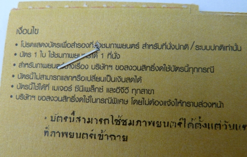 ดูหนังโรงเมเจอร์-อีจีวี เงื่อนไขคือ "ไม่ต้องจ่ายภาษีเพิ่มหน้าโรง และดูเข้าหนังใหม่ได้ตั้งแต่วันแรก แต่ไม่สามารถอัพเกรดที่นั่ง หรือเพิ่มเงินเพื่อดู 3D ได้" บัตรหมดอายุ 31 ตุลาคม 2555