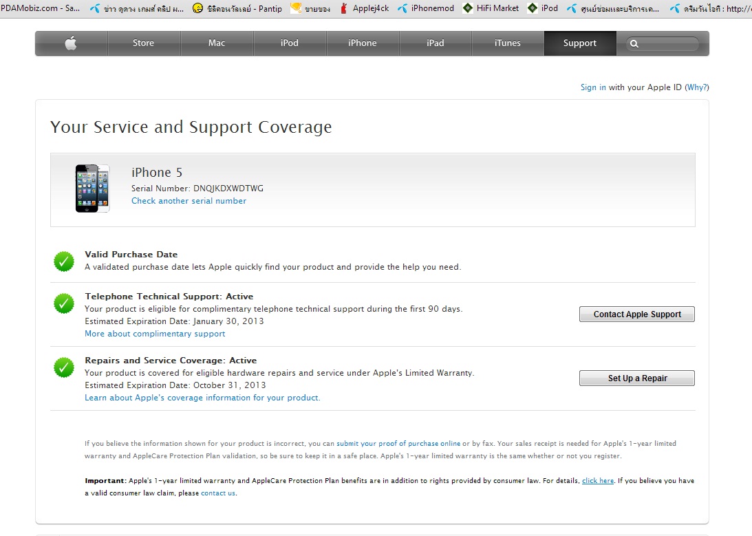 ประกัน : ประกันศูนย์อีกเกือบปี พอดีวันนี้วันอาทิตย์ผมโพสท์เข้าเว็บเช็คประกันของappleไม่ได้เพราะเขาหยุดทำการครับ ขอติดรูปประกันไว้ก่อนครับ