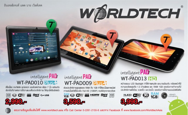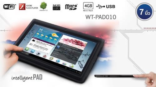 WT-PAD010 แท็บเล็ต Android 4.0 IceCream Sandwich หน้าจอสัมผัสขนาด 7 นิ้ว FULL HD 800x480 พิกเซล หน่วยประมวลผล Boxchip A13 ความเร็ว 1.2 GHz หน่วยความจำ RAM 512 MB DDR3 / ROM 4 GB กล้องหน้าความละเอียด 0.3 ล้านพิกเซล Battery 2,800 mAh